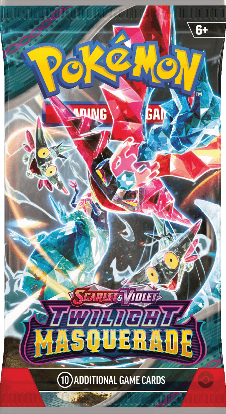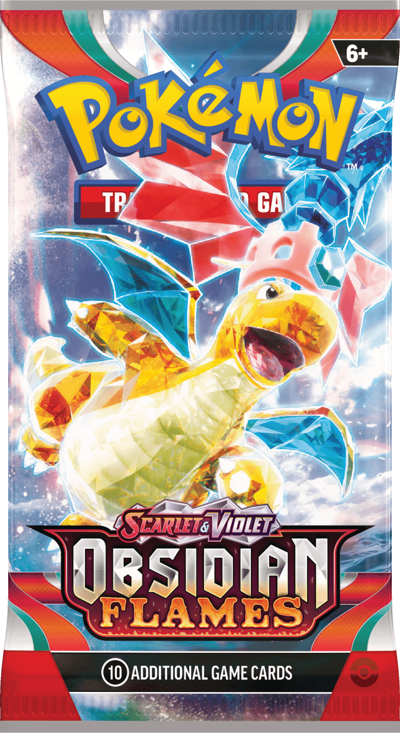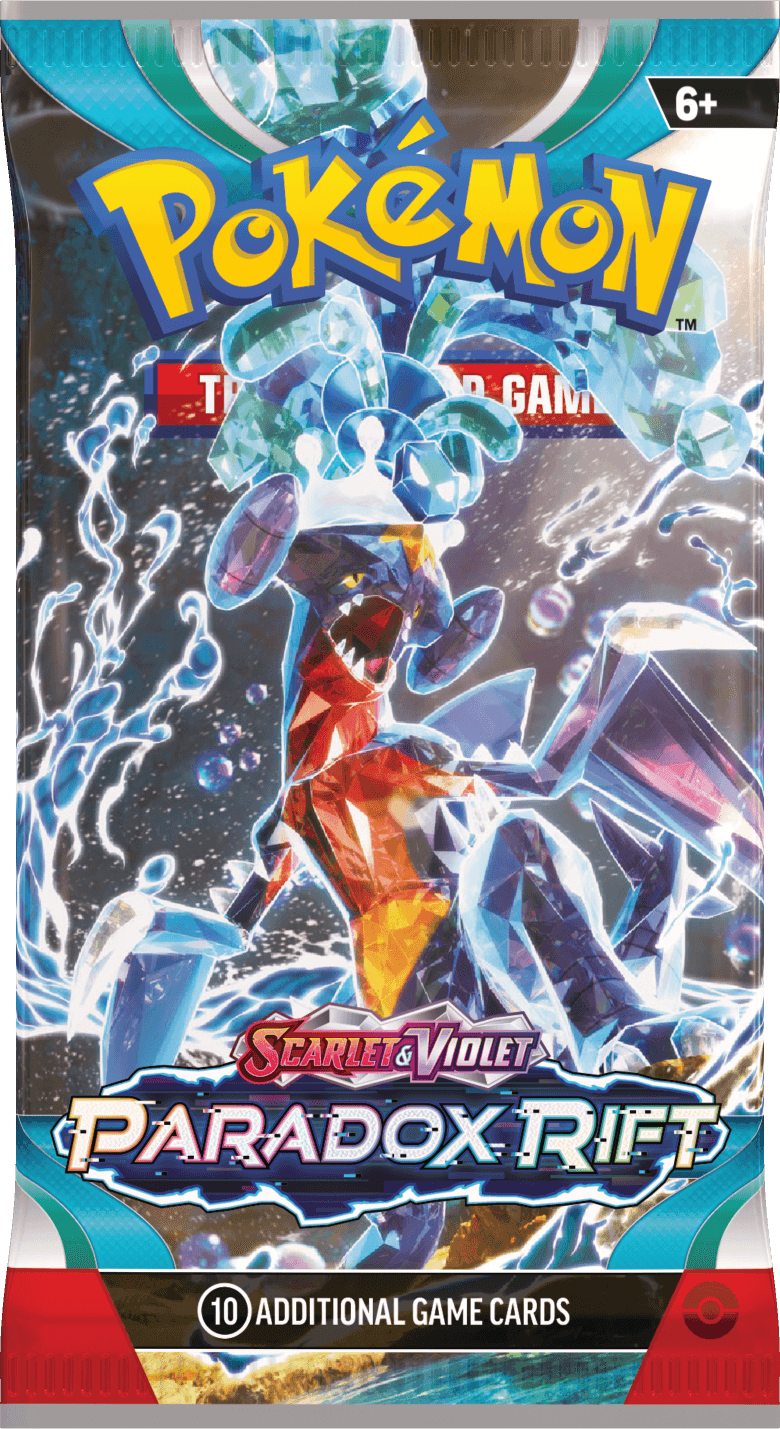 The initial set in the Scarlet and Violet era presented pack art featuring the new Paldean start Pokémon Sprigatito, Fuecoco, and Quaxly. The other three packs featured the legendary Pokemon Miraidon and Koraidon, and our first ever ‘Tera’ Pokémon to be featured on a pack art with the Water Tera type Gyarados.