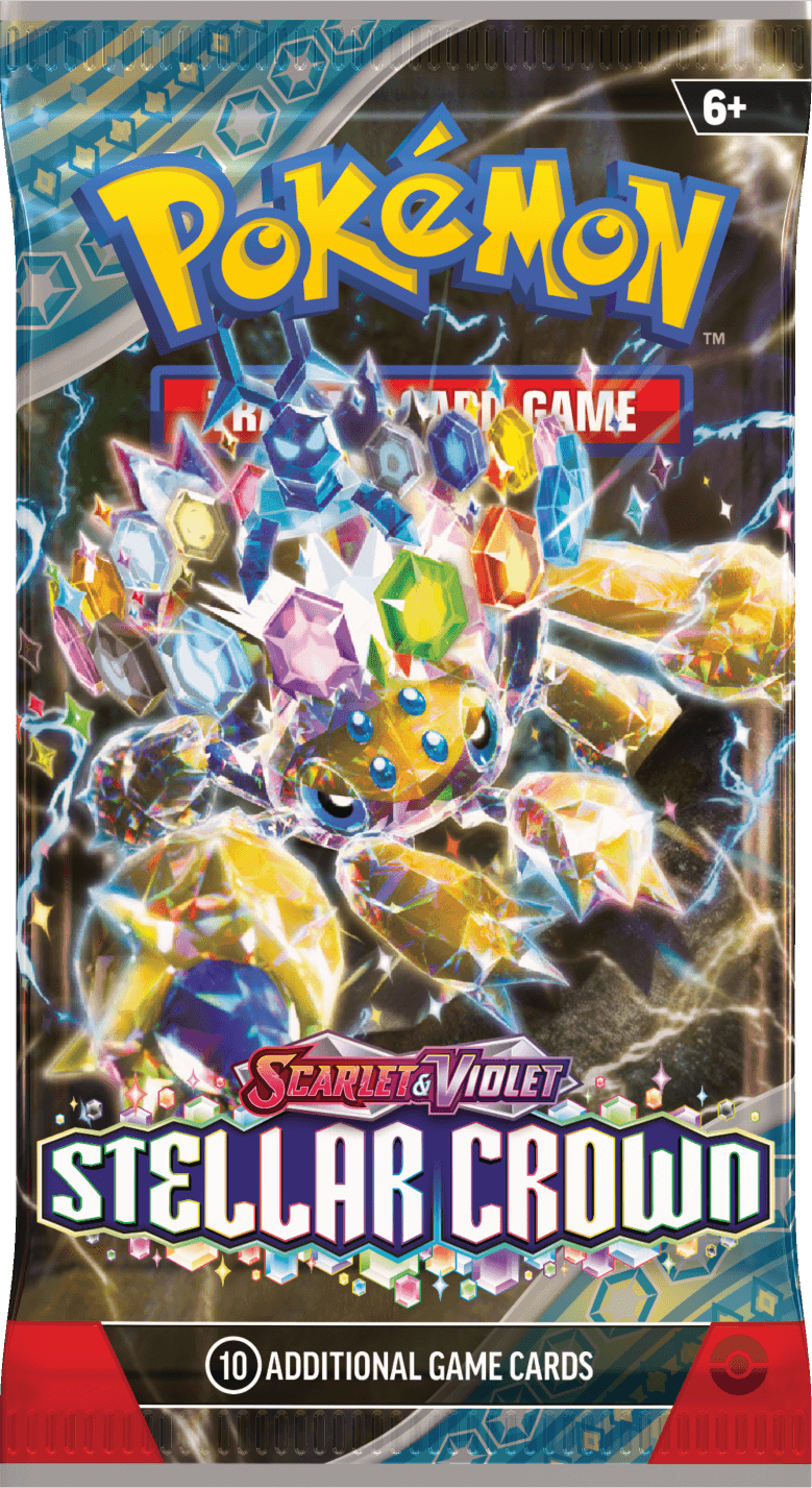 The seventh set in the Scarlet and Violet era Stellar Crown heavily features terastalized Pokemon with the new Stellar Tera Type. All 4 pack wrappers contain: Stellar Tera Type Gavalantula, Stellar Tera Type Lapras, Stellar Tera Type Cinderace, and Stellar Tera Type Terapagos.