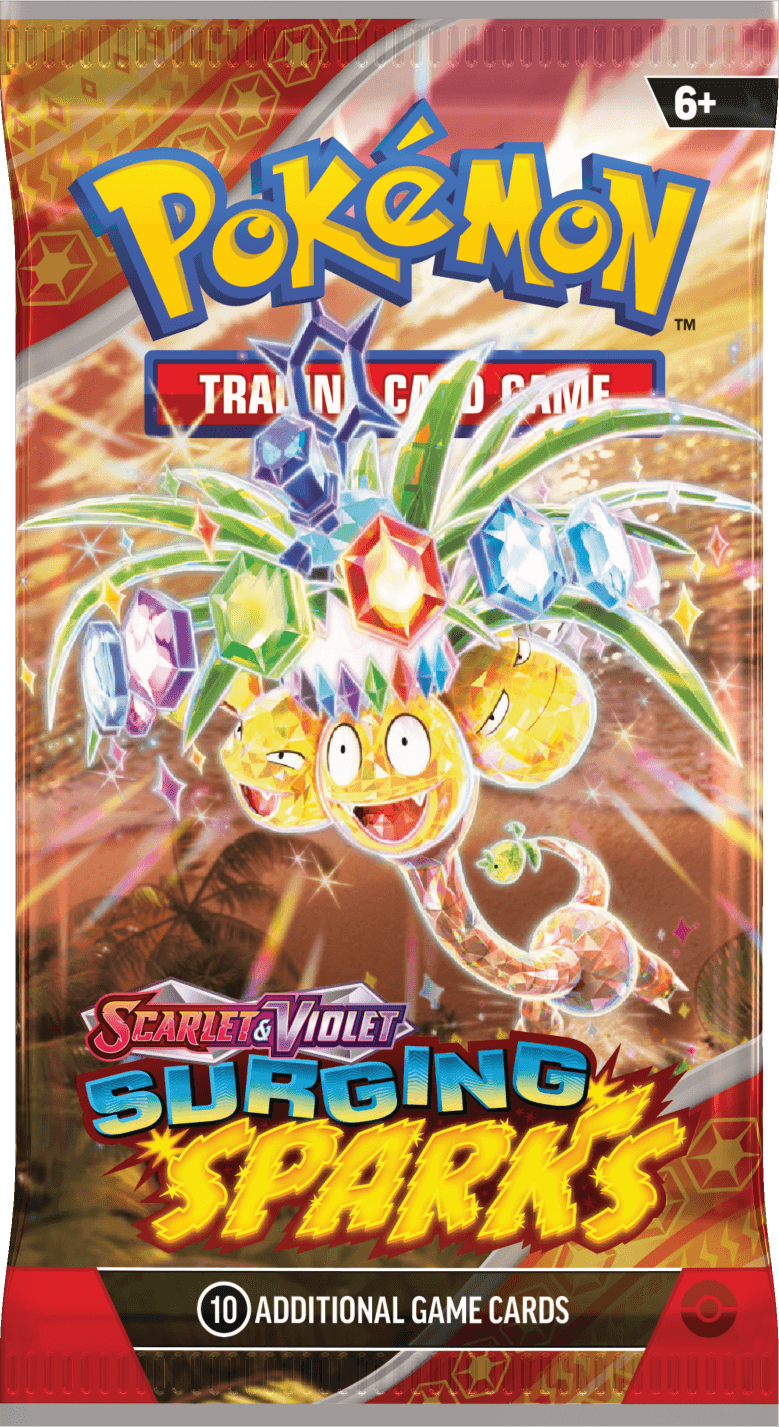 The eighth set in the Scarlet and Violet era Surging Sparks which combines both Japanese sets – Paradise Dragona (which highlights dragon pokemon) and Super Electric Breaker (which highlights a stellar type Pikachu). The Surging Sparks pack artwork features stellar tera Pikachu ex and Alolan Exeggutor, as well as regular Latias/Latios, and Archaludon.